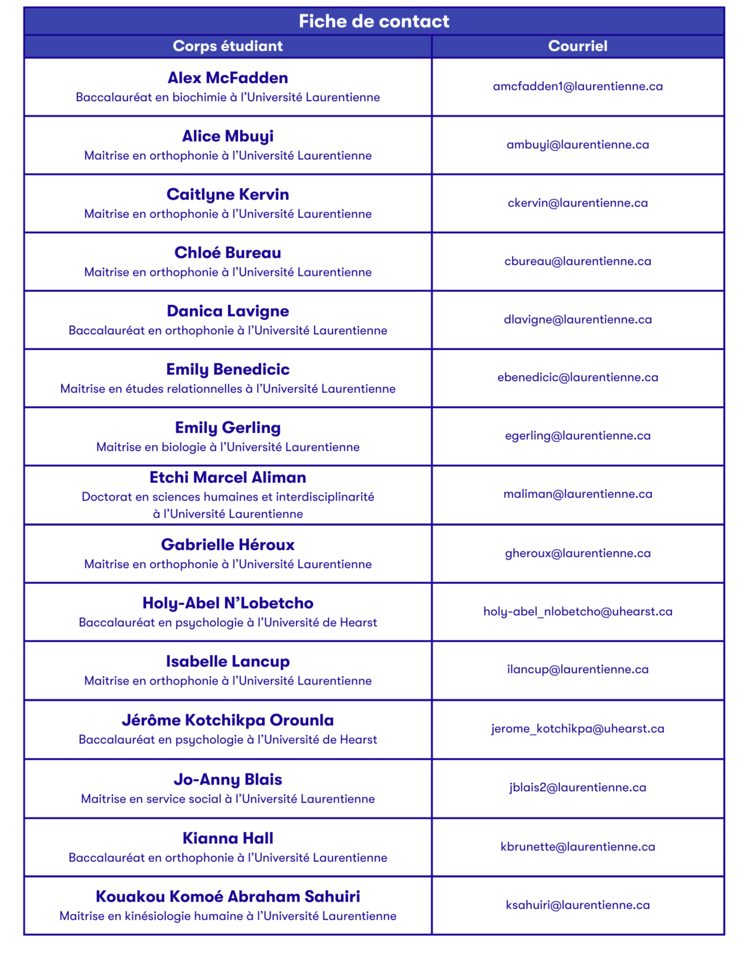 Vous souhaitez assister en personne à la journée du 5 mars ? Veuillez vous rendre sur le campus de l’Université Laurentienne à la salle FA-386 (troisième étage - Fraser), ou encore à la salle F-338B (troisième étage - Science 2A).