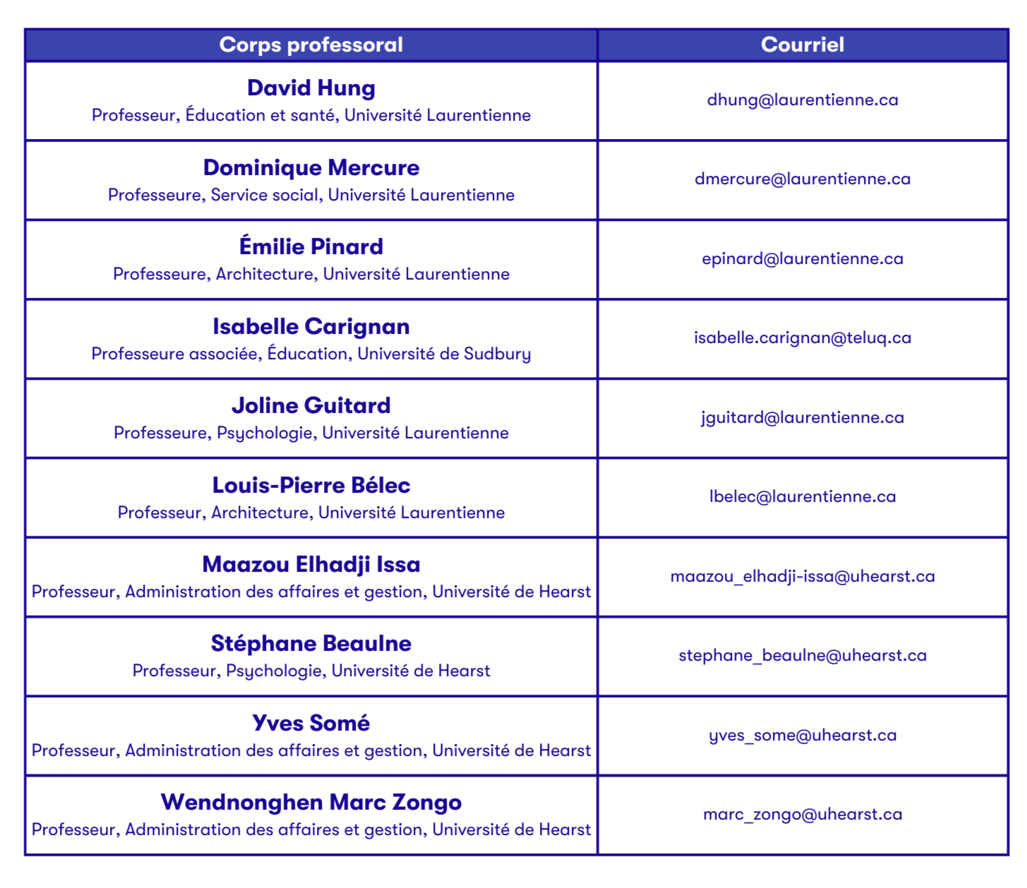Vous souhaitez poursuivre la discussion sur une communication ou poser une question à l’un·e de nos participant·es après l’évènement ? Consultez la liste des adresses électroniques de nos conférencières et conférenciers ci-dessous. Profitons pleinement des occasions de réseautage !