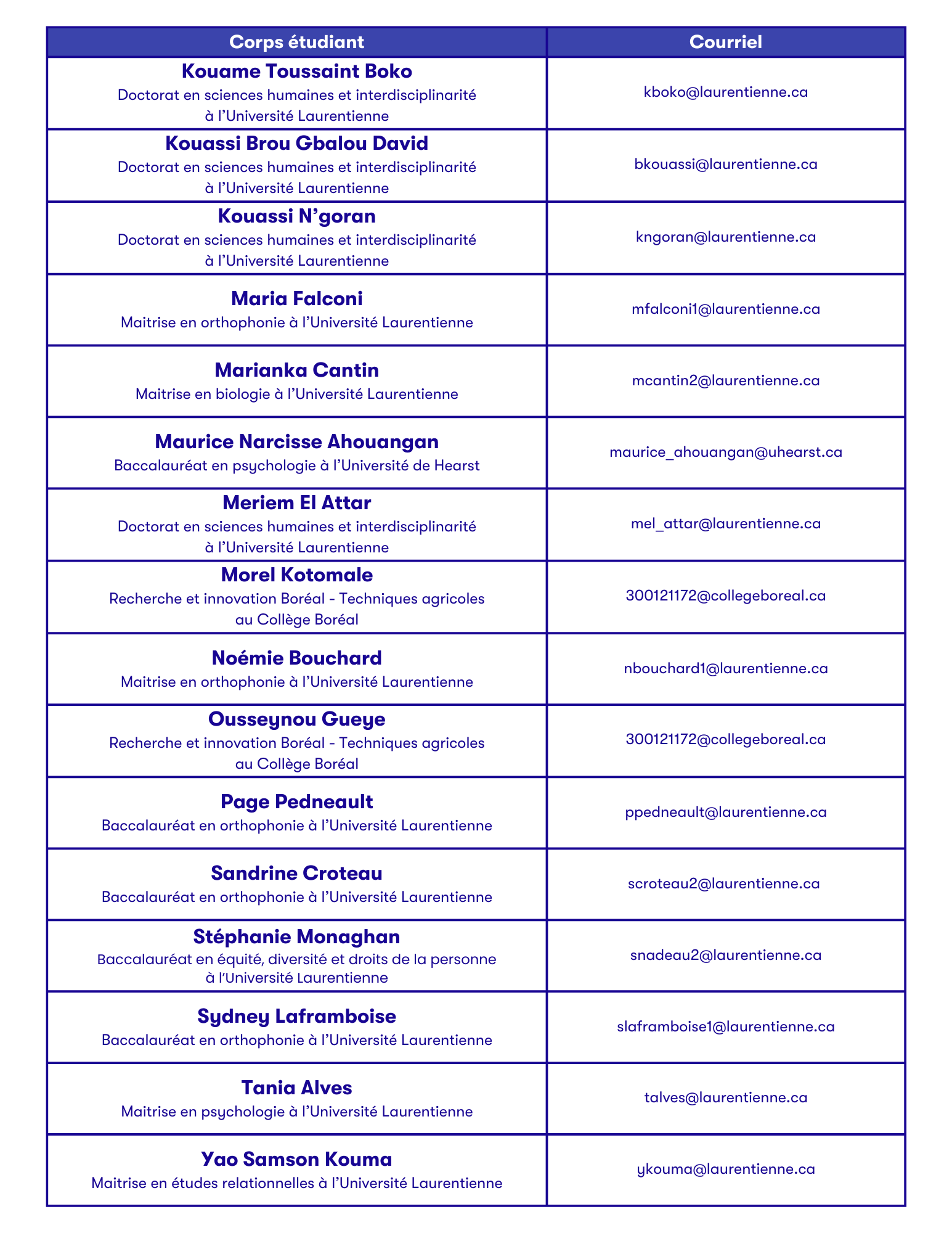 8 h 40 à 9 h : Danica Lavigne, Baccalauréat en orthophonie, Université Laurentienne (« Appuyer les parents d’enfants en contexte francophone minoritaire pour développer le français : une étude »)