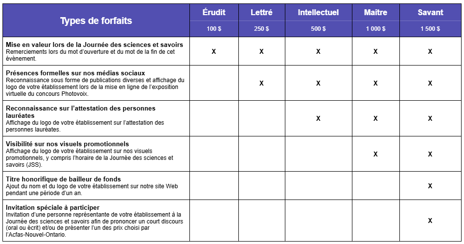 Si vous souhaitez, vous aussi, appuyer les activités de l'Acfas-Nouvel-Ontario, veuillez consulter les forfaits de commandite ci-dessous et communiquez avec nous (acfasnouvelontario@gmail.com).
